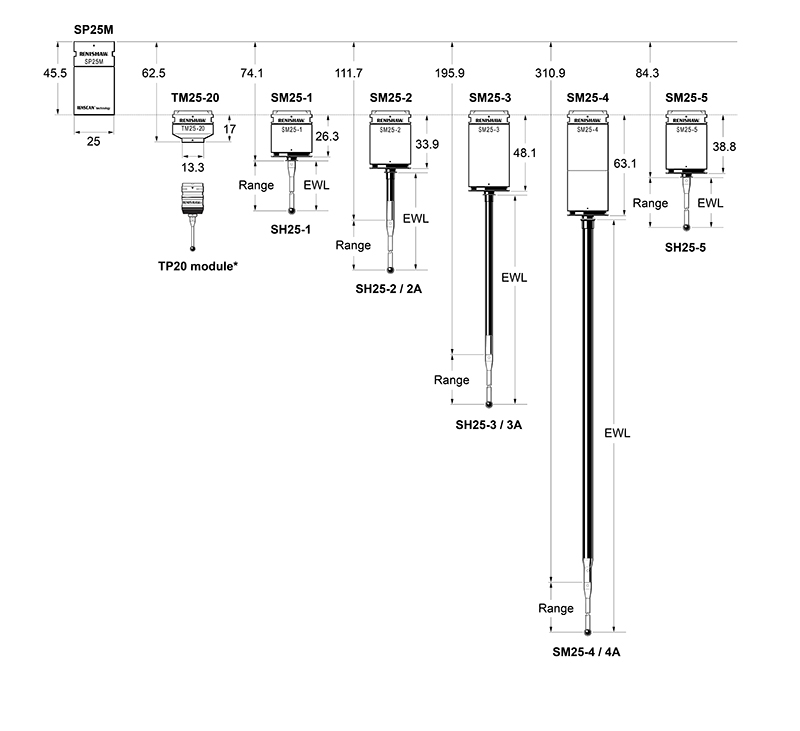 Система SP25M заключает два датчика в одном корпусе. Пользователь имеет возможность выбирать нужный вариант среди пяти сканирующих модулей (в которые могут устанавливаться щупы М3 длиной от 20 до 400 мм) или же работать с переходным модулем, совместимым с измерительными модулями серии ТР20 компании Renishaw. Тем самым обеспечивается возможность выполнения одной и той же системой как сканирования, так и измерений контактным триггерным датчиком.